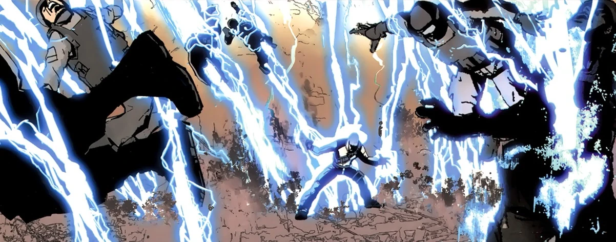 ↑Esto sería aprovechado por Joseph Bertrand, quien había atrapado a Cole en una jaula de Faraday que no pudo atravesar, mientras que la Milicia lo mataría a tiros por encontrarse en una zona a oscuras sin fuentes de energía que drenar.