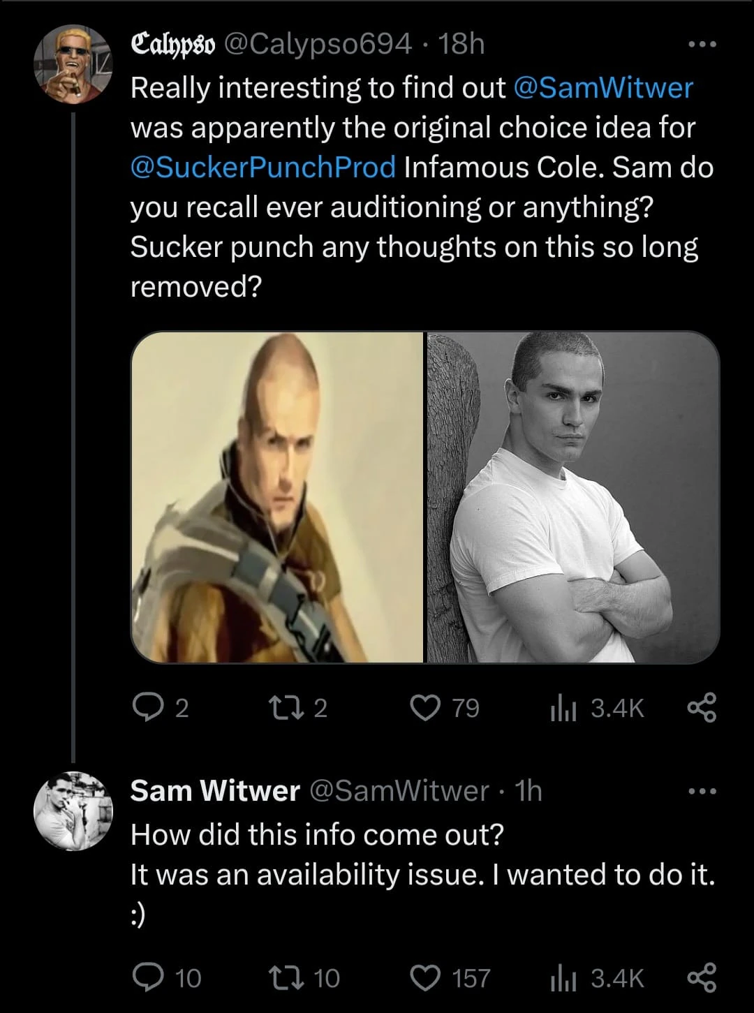 El 16 de julio de 2024, Sam Witwer, famoso por interpretar a Starkiller en los juegos Star Wars: The Force Unleashed y a Darth Maul en proyectos multimedia, confirmó que originalmente fue elegido para interpretar a Cole MacGrath en el inFamous original, pero tuvo que abandonar debido a compromisos previos.