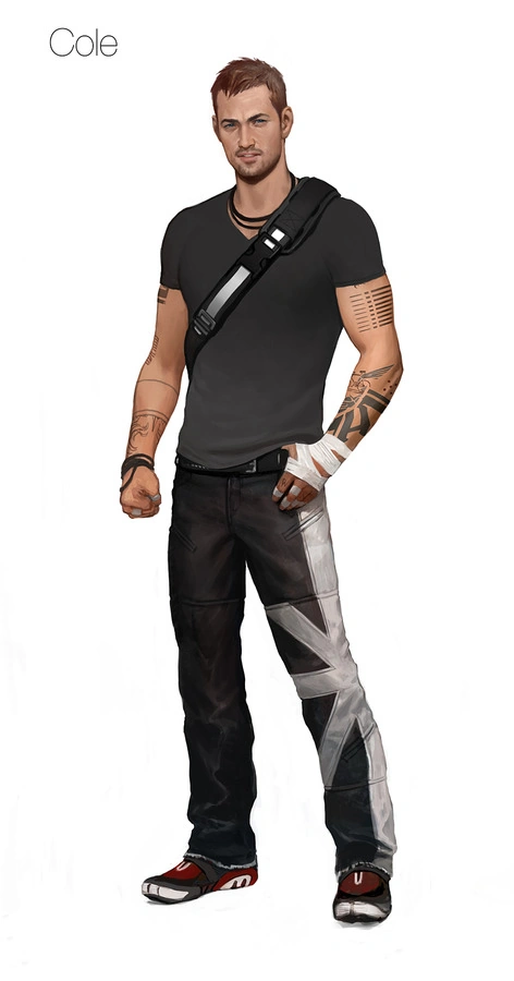 Varios artes conceptuales de Cole se realizaron bajo el nombre de "Chance". Allí, Cole llevaba un bolso bandolera y una chaqueta similar a su versión final. Además, Cole vestía pantalones deportivos negros con caracteres japoneses y la letra "Z" en el lado derecho, con una franja amarilla. Cole también levantó un poco el lado izquierdo de su pantalón, mostrando las vendas en su pierna. También era calvo y llevaba un pañuelo que le cubría todo el rostro y tenía un arma guardada en la faja de su bolso.