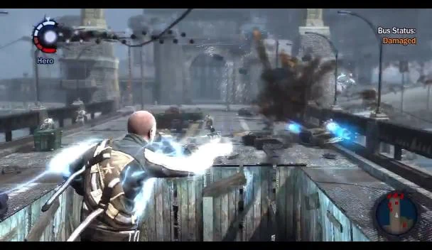"Anything for Trish" is considered one of the most difficult missions in InFamous. The reasons pointed to for this are: the overwhelming number of enemies, the bus's low damage threshold and the length of the mission. It's been specially designed with Cole in mind; it'll only move when he's on top and provides him unlimited electricity. Get on top and it will start rolling. The roof is permanently electrified so the player can use any powers on hand, including Precision, which consumes a lot of energy. The most prominent threat comes from the enemies wielding rocket launchers, which must be deflected via Shockwave and then open fire back at them. A helpful tip is the fact the enemies only attack Cole and not the bus. Therefore, if Cole leaves the bus to fight, it will not receive any damage.